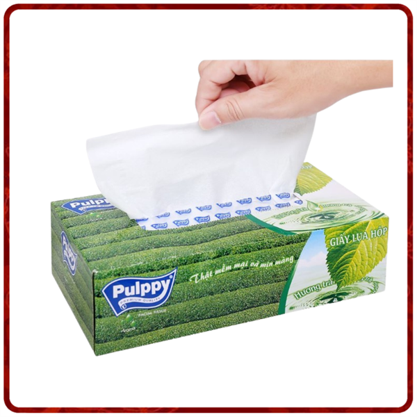 Khăn giấy lụa của thương hiệu khăn giấy Pulppy sản xuất tại Việt Nam trên dây chuyền công nghệ cao. Khăn giấy lụa Pulppy hương trà xanh 2 lớp hộp 100 tờ xuất xứ bột giấy nguyên chất, nhỏ gọn, bỏ túi tiện dụng có thể mang khi đi học, du lịch, dã ngoại tùy theo mục đích.