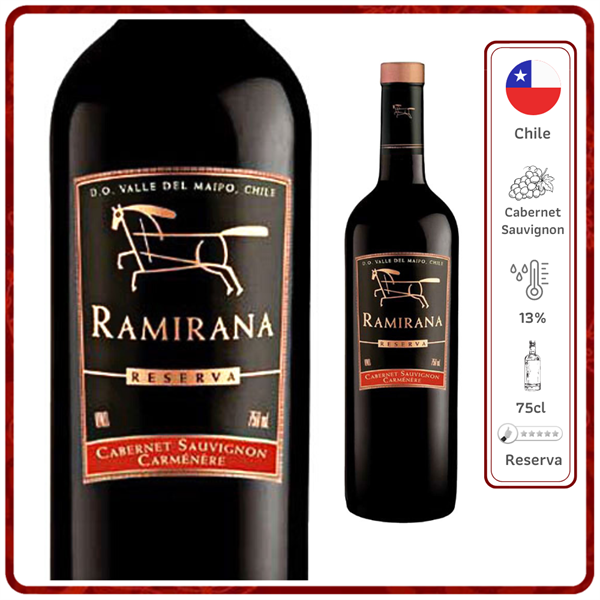 Rượu Vang Ramirana Reserva sản xuất tại vùng đất Chile nơi mà rượu vang được ưa chuộng và bán chạy nhất từ trước đến nay. Rượu Vang Ramirana Reserva là loại rượu vang được làm từ nguyên liệu Cabernet Sauvigon tại Chile mang hương trát cây ngào ngạt giúp kích thích vị giác trong bữa ăn.Rượu Vang Ramirana Reserva với hương ngào ngạt của mâm xôi, việt quất từ Cabernet Sauvignon. Hương gia vị cổ điển của Carménère như tiêu đen và ớt chuông đỏ. Hương vanilla và trái cây khô từ gỗ sồi Pháp. Cân bằng hoàn hảo. Độ chát mượt mà hòa quyện của Cabernet Sauvignon và Carménère.Đặc điểm của Rượu Vang Ramirana Reserva