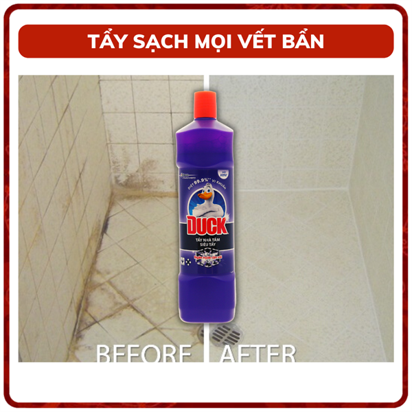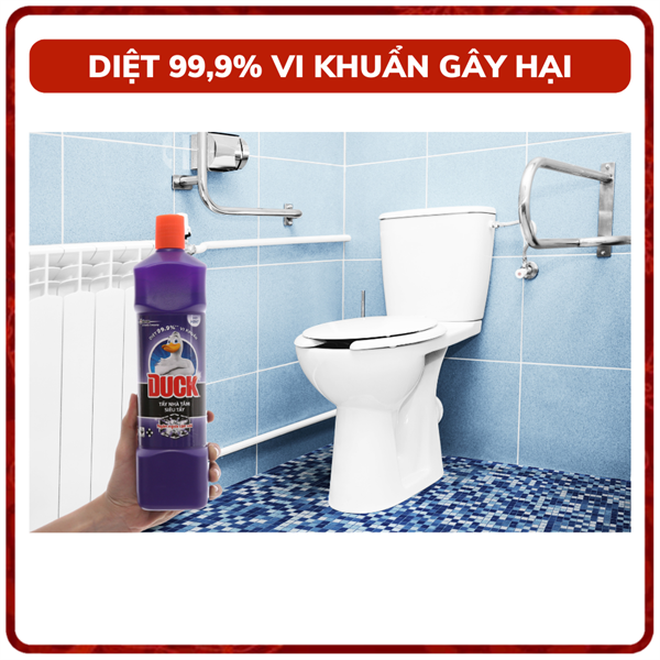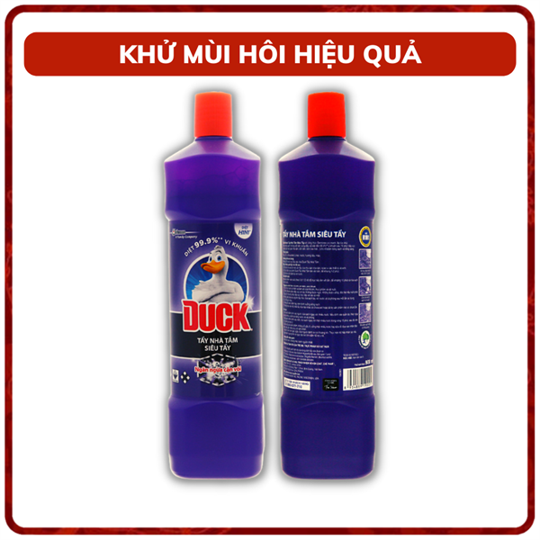 Với công thức tẩy rửa nhà tắm siêu ưu việt, nước tẩy nhà tắm Duck giúp tiêu diệt 99,9% vi khuẩn từ sâu bên trong mép bồn cầu, loại bỏ cặn bẩn, mùi hôi hiệu quả. Nước tẩy nhà tắm Duck siêu tẩy 900ml cho nhà tắm của bạn sạch bong, sáng bóng cực mạnh.
